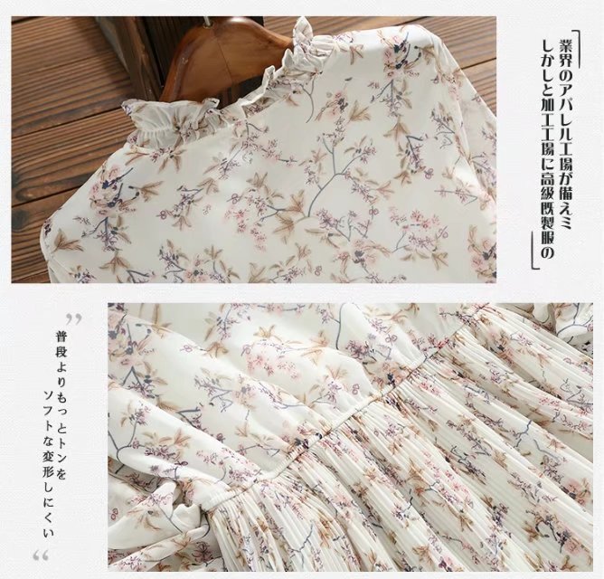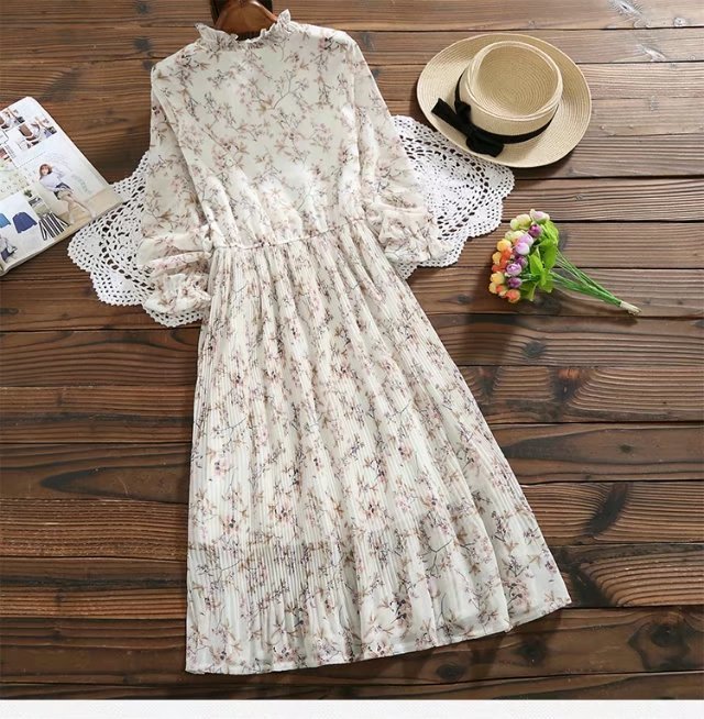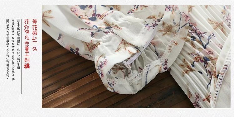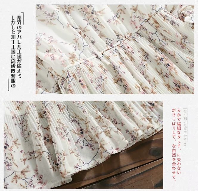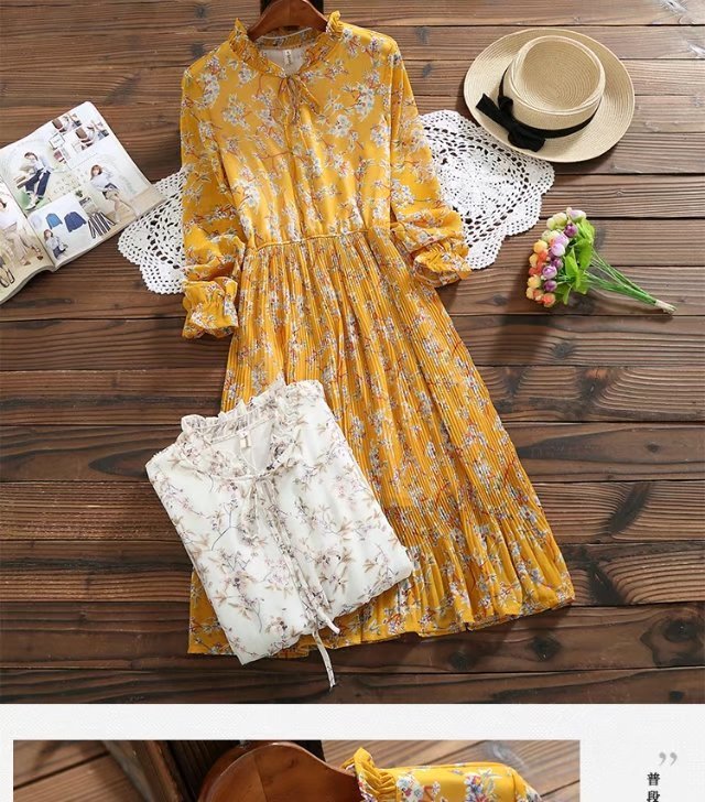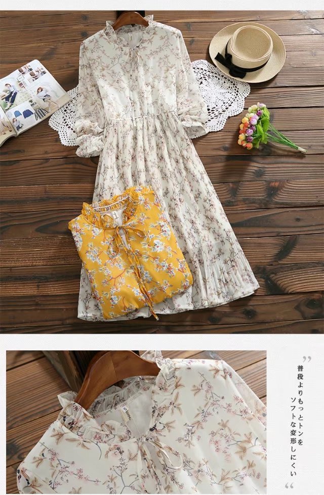 春季新款文藝系帶清新雪紡碎花中長款松緊腰顯瘦百褶連衣裙S7056